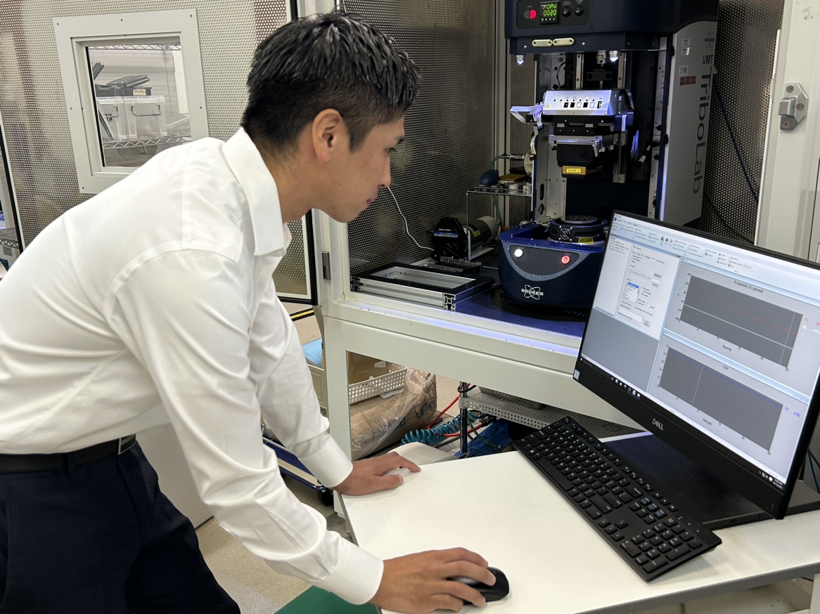 今後は、よりスペックの高い設備を拡充し、試験領域を広げることでJTLの摩擦摩耗試験としての出来る範囲を増やしていきたいと考えています。試験領域を拡大することで、よりお客さんの商品に直結するような試験も対応できるようになり、JTLで持ち合わせている技術力と掛け合わせることで解析系の評価にも繋げられると思っています。僕は、摩擦摩耗試験の立ち上げから担当させていただいていますが、摩擦摩耗試験は突き詰めれば様々な試験や分析に繋げられると思うので、お客様のニーズに応じて、多角的な提案を今後も続けていきたいです。